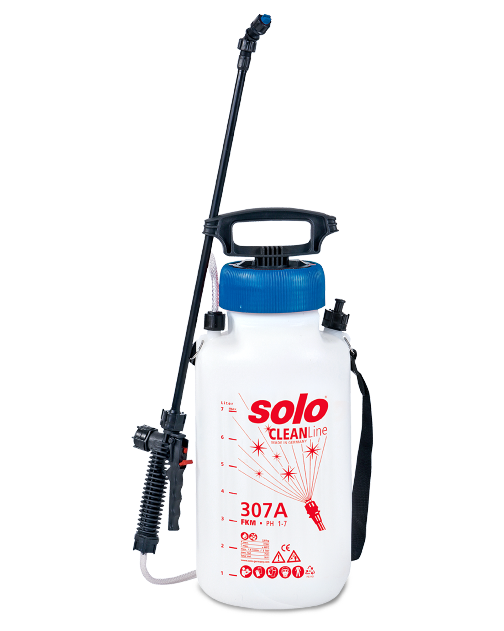 Die schultertragbare und extrem robuste SOLO 307 A Druckspritze mit FKM-Dichtung und 7 Liter Füllvolumen ist für säurehaltige Reinigungsmittel mit niedrigen pH-Werten (1-7) geeignet. Auch resistent gegen Kohlenwasserstoffe (ölhaltige und lösungsmittelhaltige Produkte). Für die professionelle Reinigung von mittleren bis großen Flächen.