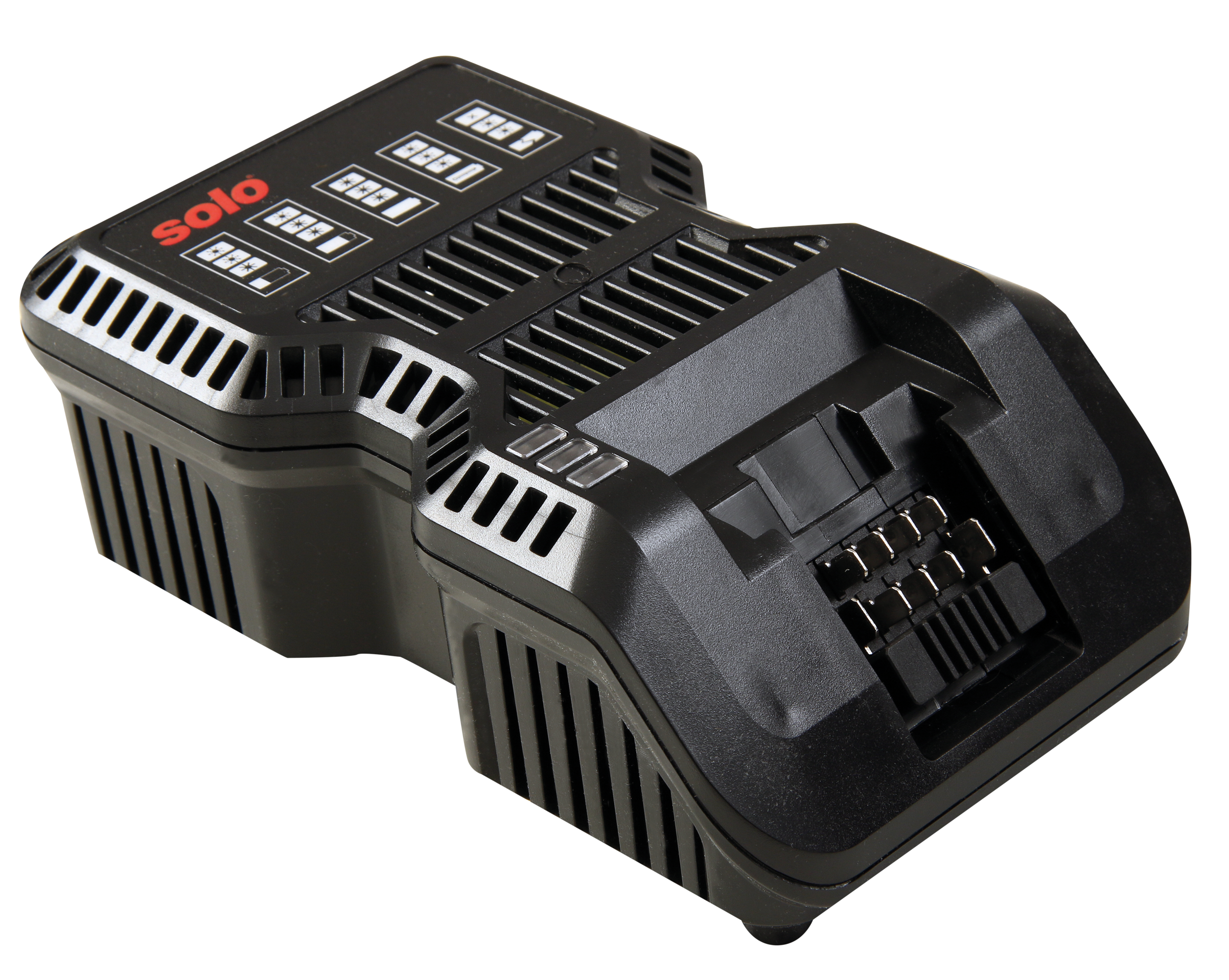 Kompaktes Ladegerät zur externen Aufladung von SOLO 18V Li-Ionen Akkus. Mit LED Ladezu- standsanzeige.