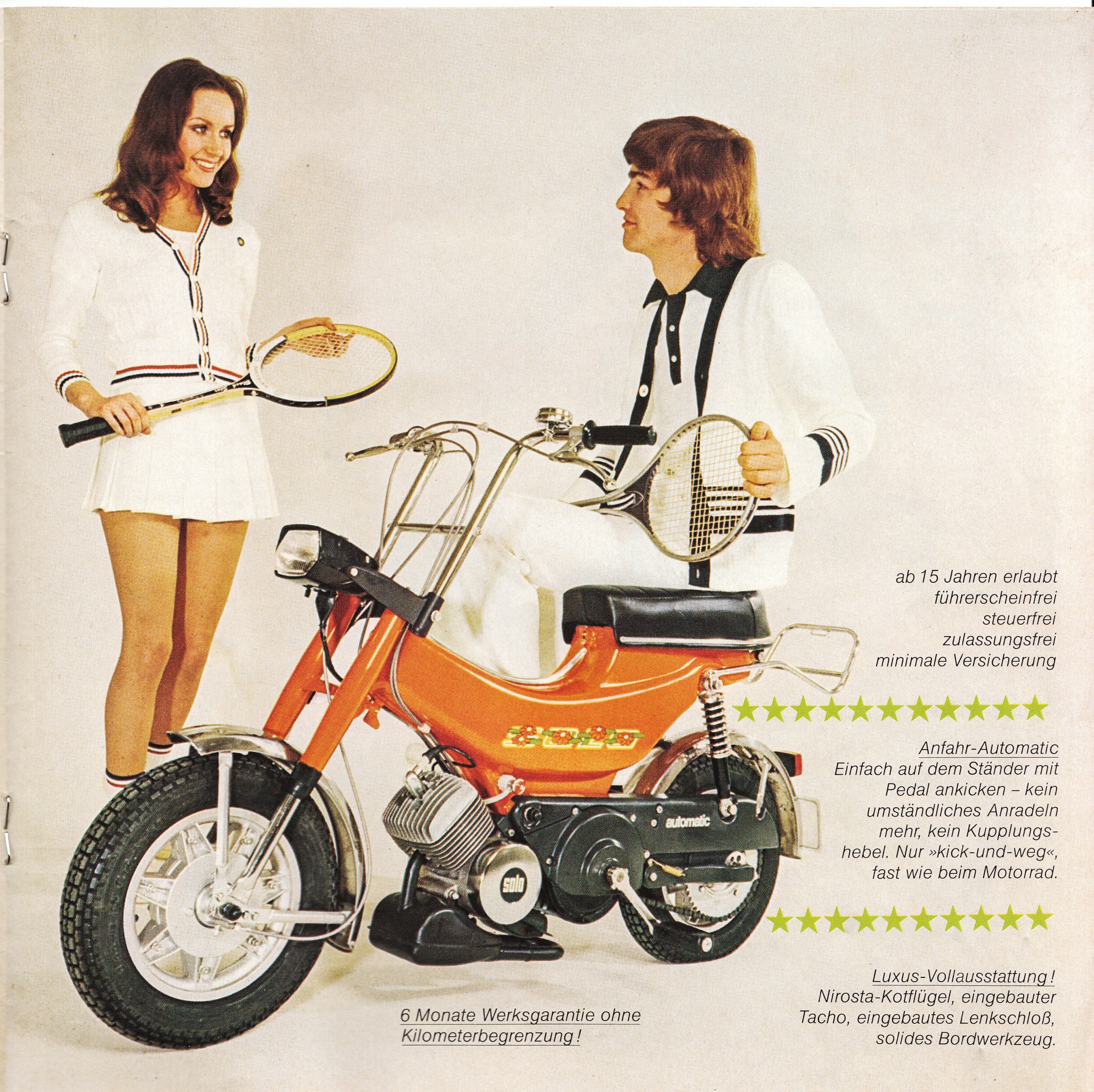 Das Motorfahrrad, auch kurz Mofa genannt, wurde 1972 vorgestellt, ging aber erst im Jahre 1973 als Serie auf dem Markt. Rund 2 Millionen Fahrzeuge wurden von SOLO bis zu diesem Jahr produziert.